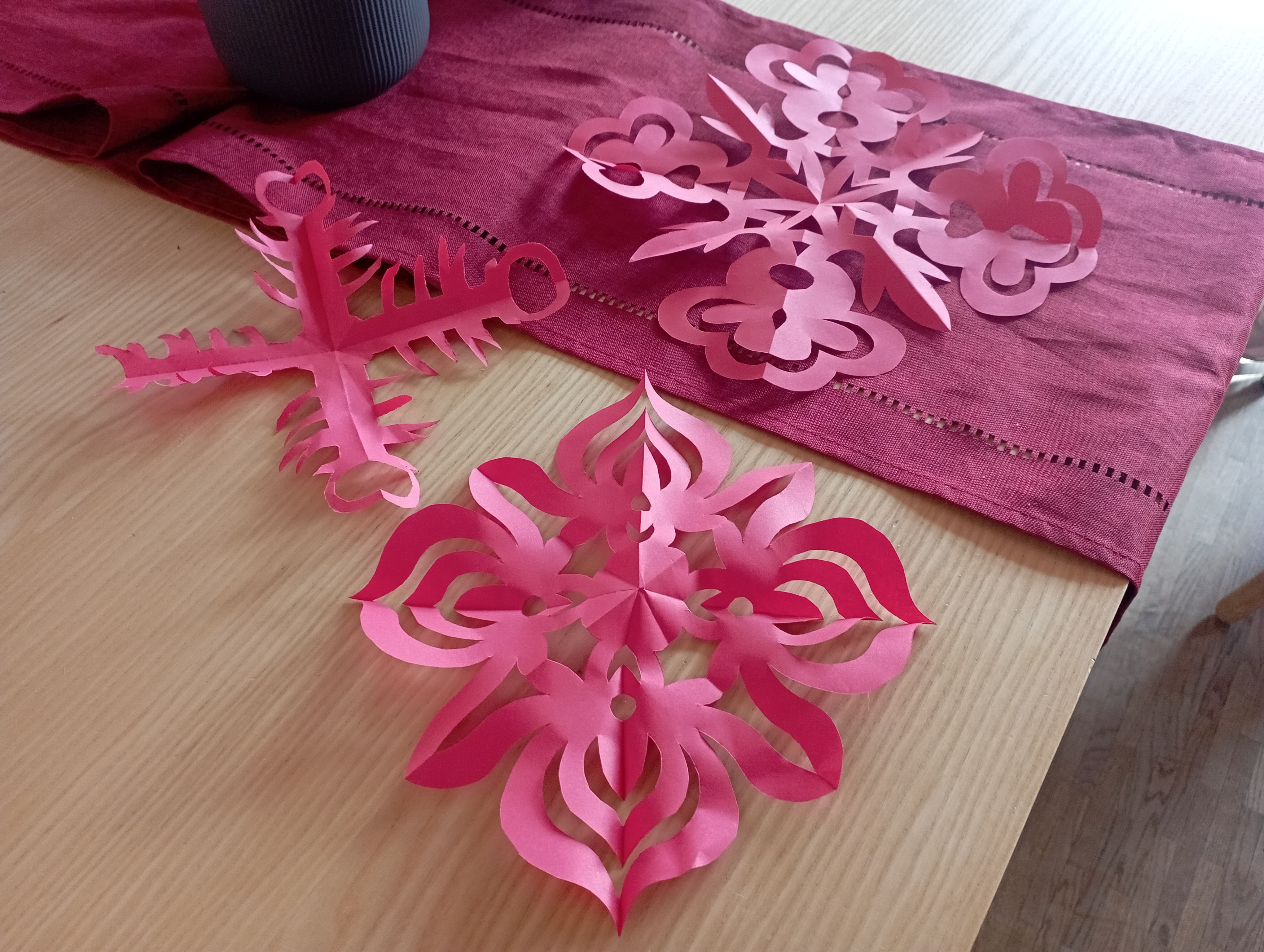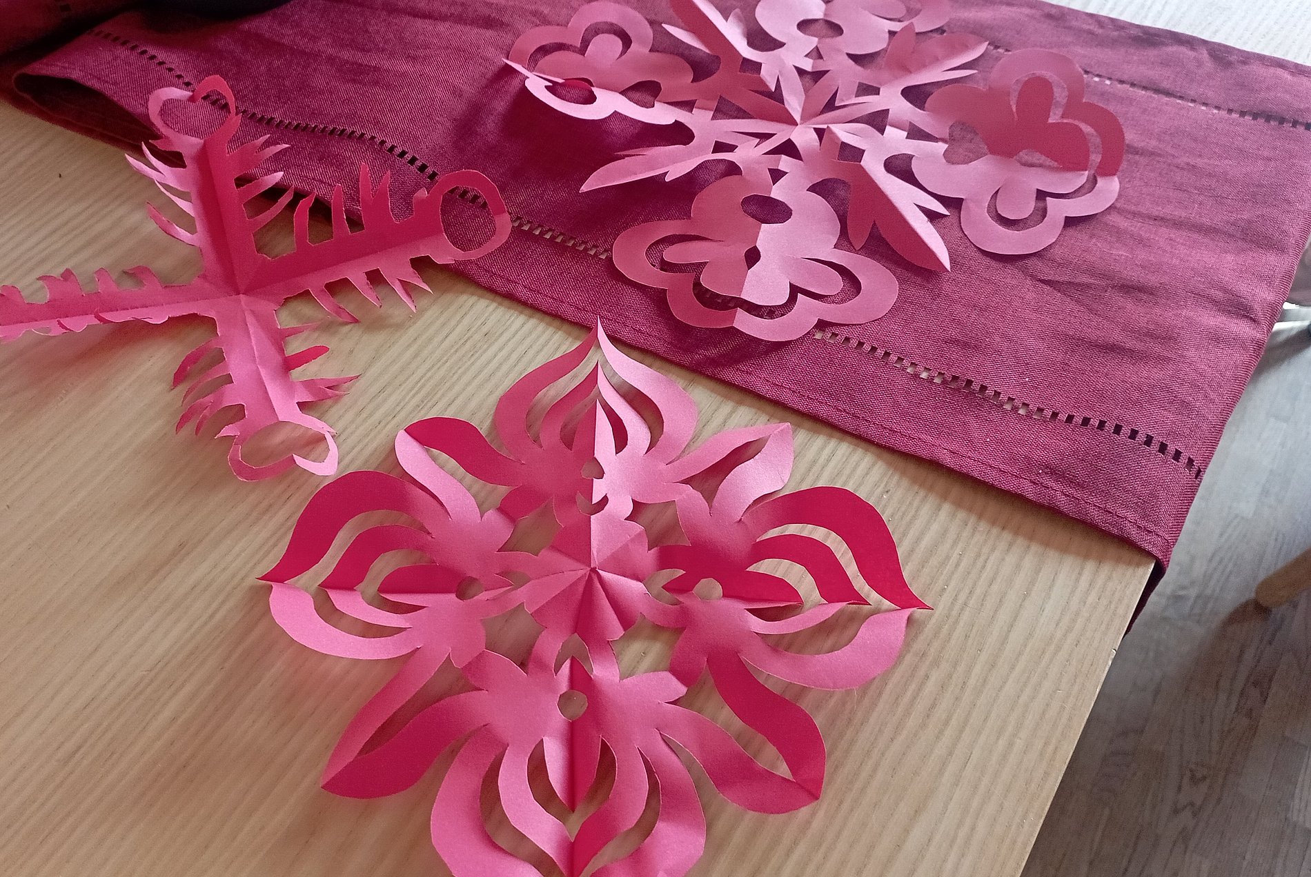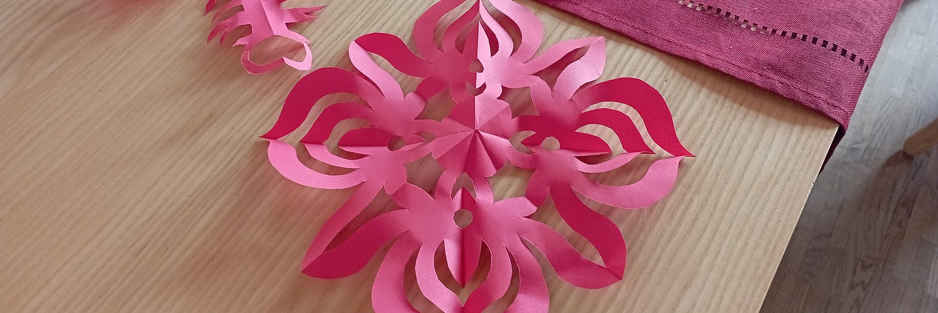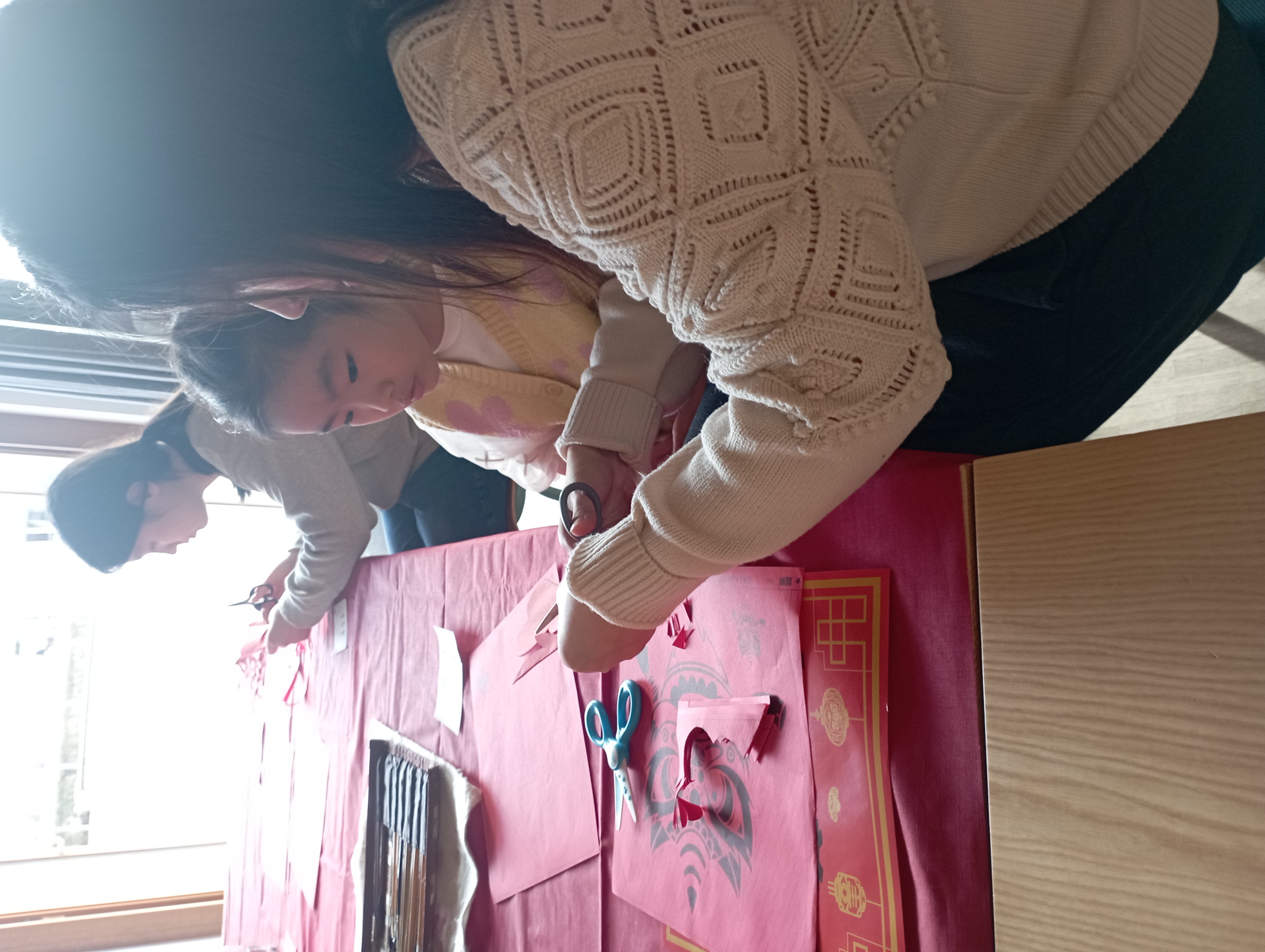 Die Fensterbilder aus rotem Papier wurden mit einer besonderen Falt- und Schneidtechnik hergestellt. Frau Ran erläuterte: „Die Schnitte stellen Symbole für den Frühling, für Glück, Blumen und Früchte dar.“
