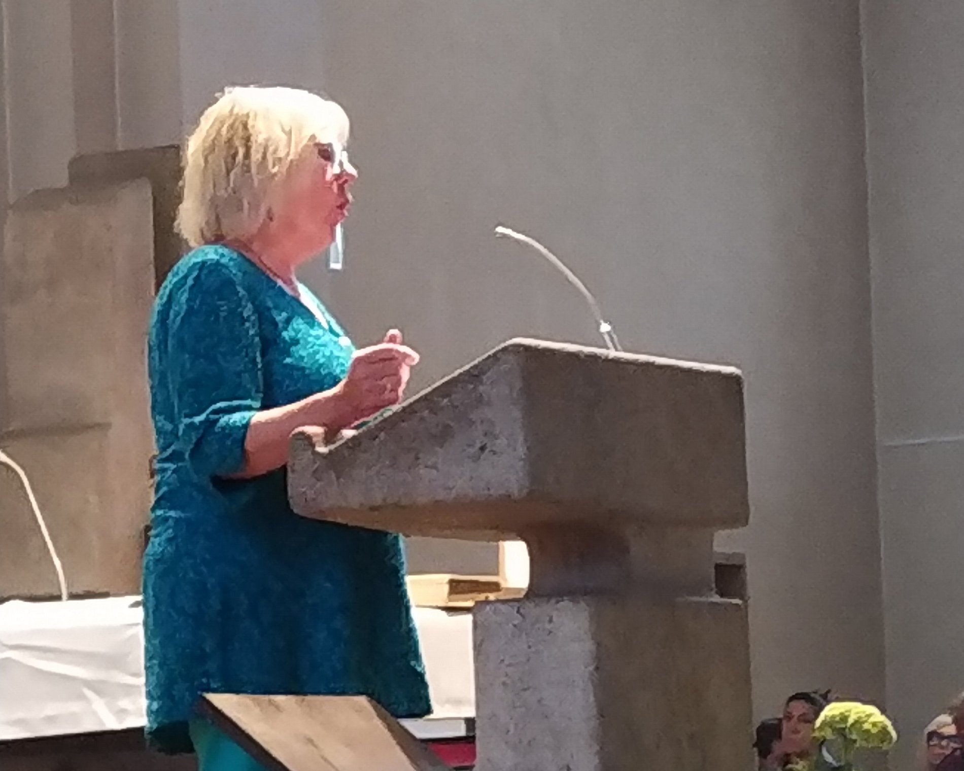 Grün waren die Gewänder der Zelebranten im Festgottesdienst um 11h in der vollbesetzten Markuskirche, darunter auch Pfarrverwalter Sauer. Und gleich zu Beginn verwies Gemeindereferentin Isabel Sieper darauf, dass für unsere Hildegard die Farbe Grün eine ganz besondere Bedeutung hat. Welche, das erläuterte Monika Stannossek in ihrer ohne Skript gehaltenen Predigt, in der sie nebst einem Kurzabriß über das Leben der Hl. Hildegard den Gemeindemitgliedern die Grünkraft näherbrachte.