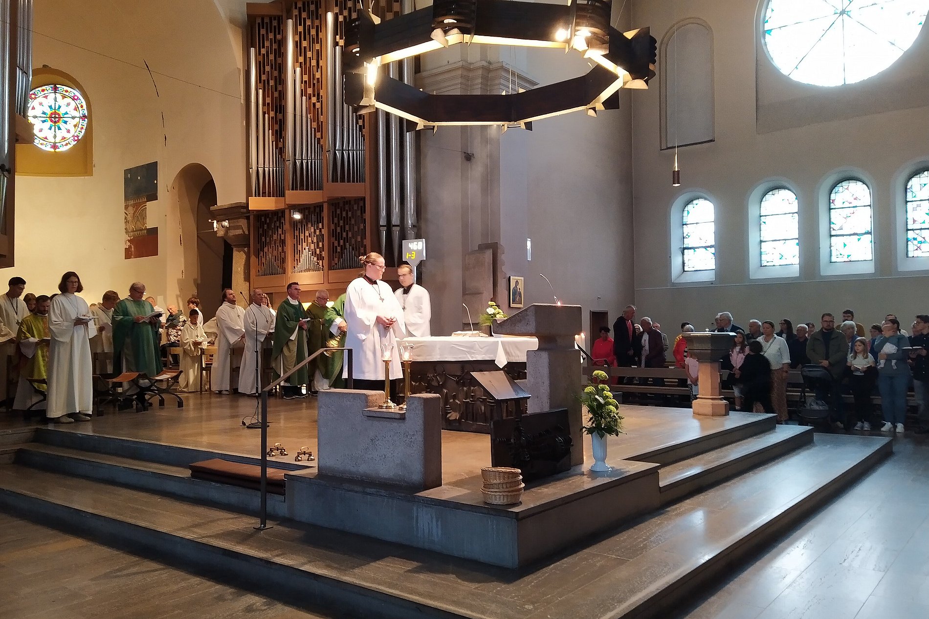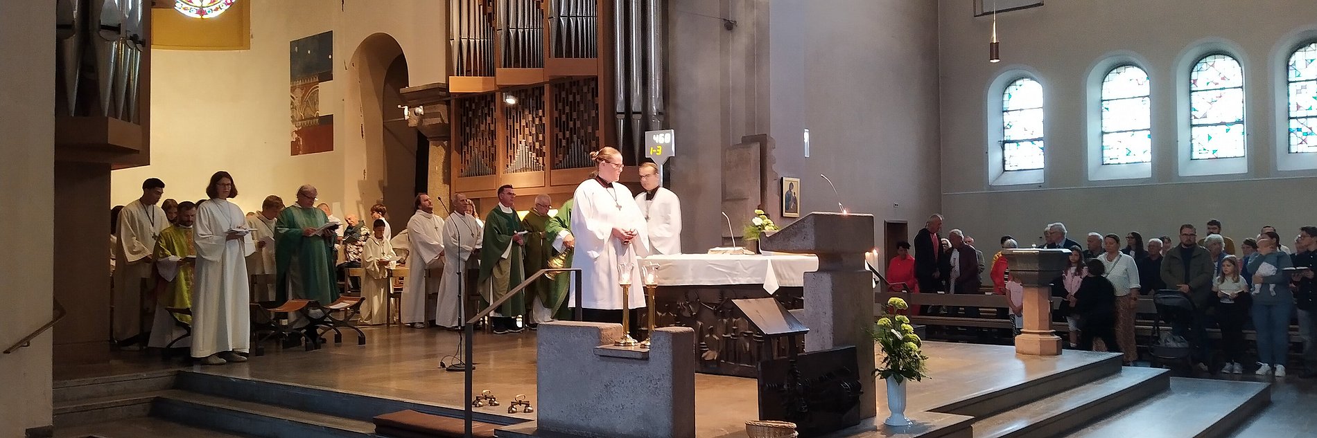 So lang, dass der Pastoralreferent, kaum mit den Kindern zurück in der Pfarrkirche, seine Begeisterung mit der gesamten Gemeinde teilte. Die einen nicht minder interessanten und schönen Gottesdienst feierte. Fürbitten in sechs verschiedenen Sprachen von Gemeindemitgliedern auch der muttersprachlichen Gemeinden, grünes Gemüse zur Gabenbereitung, nach vorne gebracht durch einige der Kinder, der Projektchor, der den Gottesdienst musikalisch begleitete, ganz besonders Chorleiter Carsten Rupp, der die Gemeinde in einen Kanon mit den Chor führte, waren ein paar weitere Highlights des Festgottesdiensts.