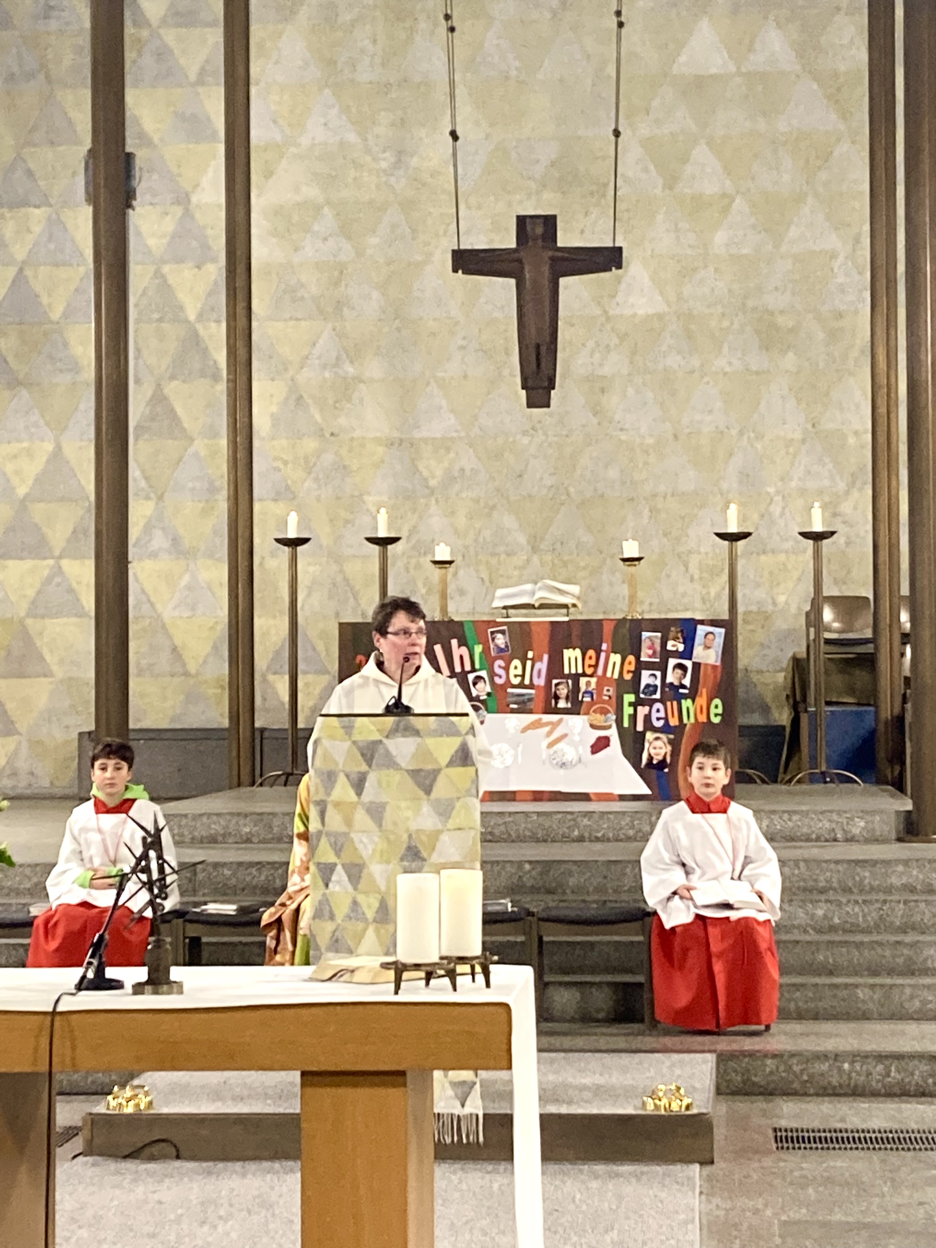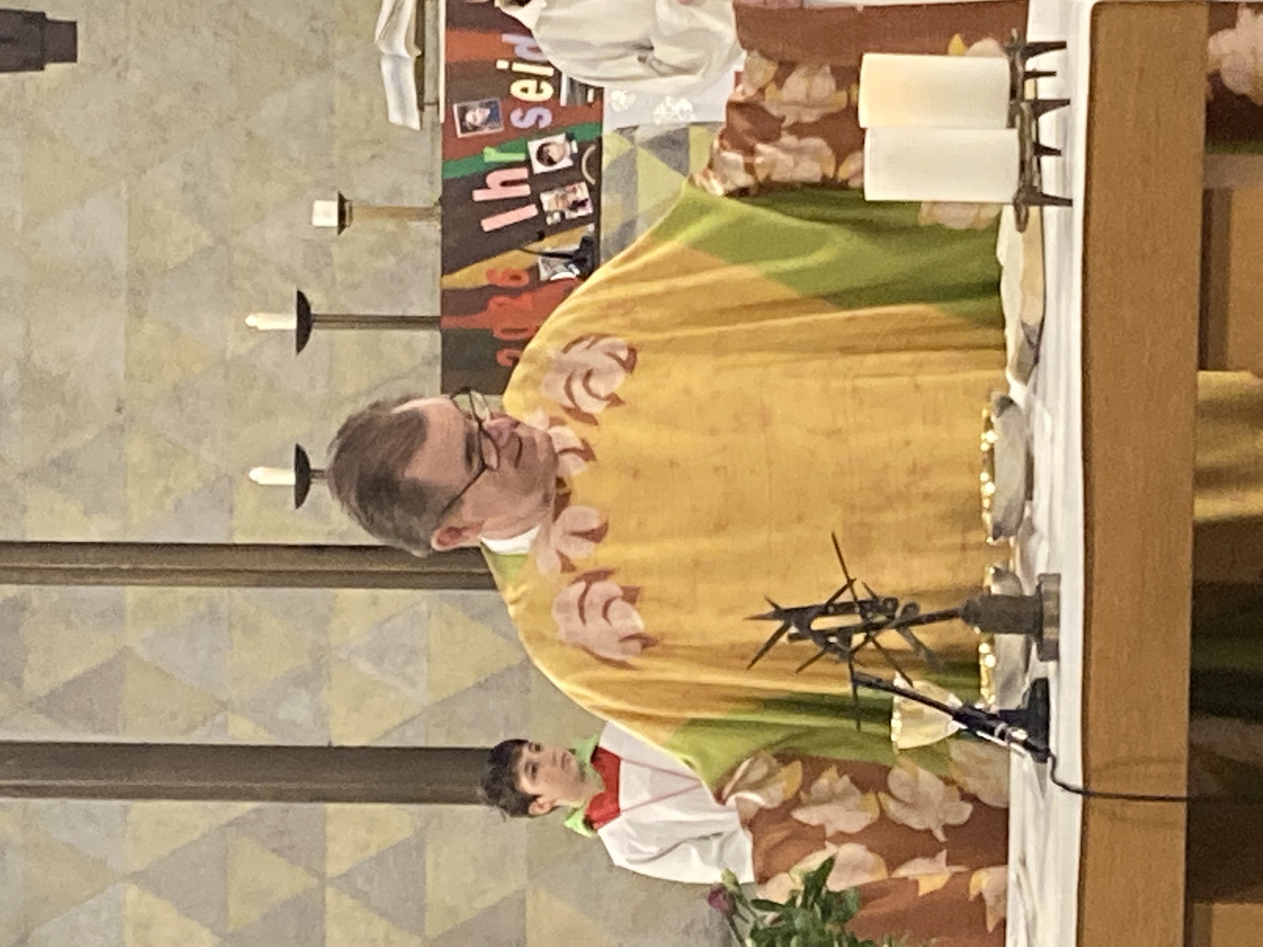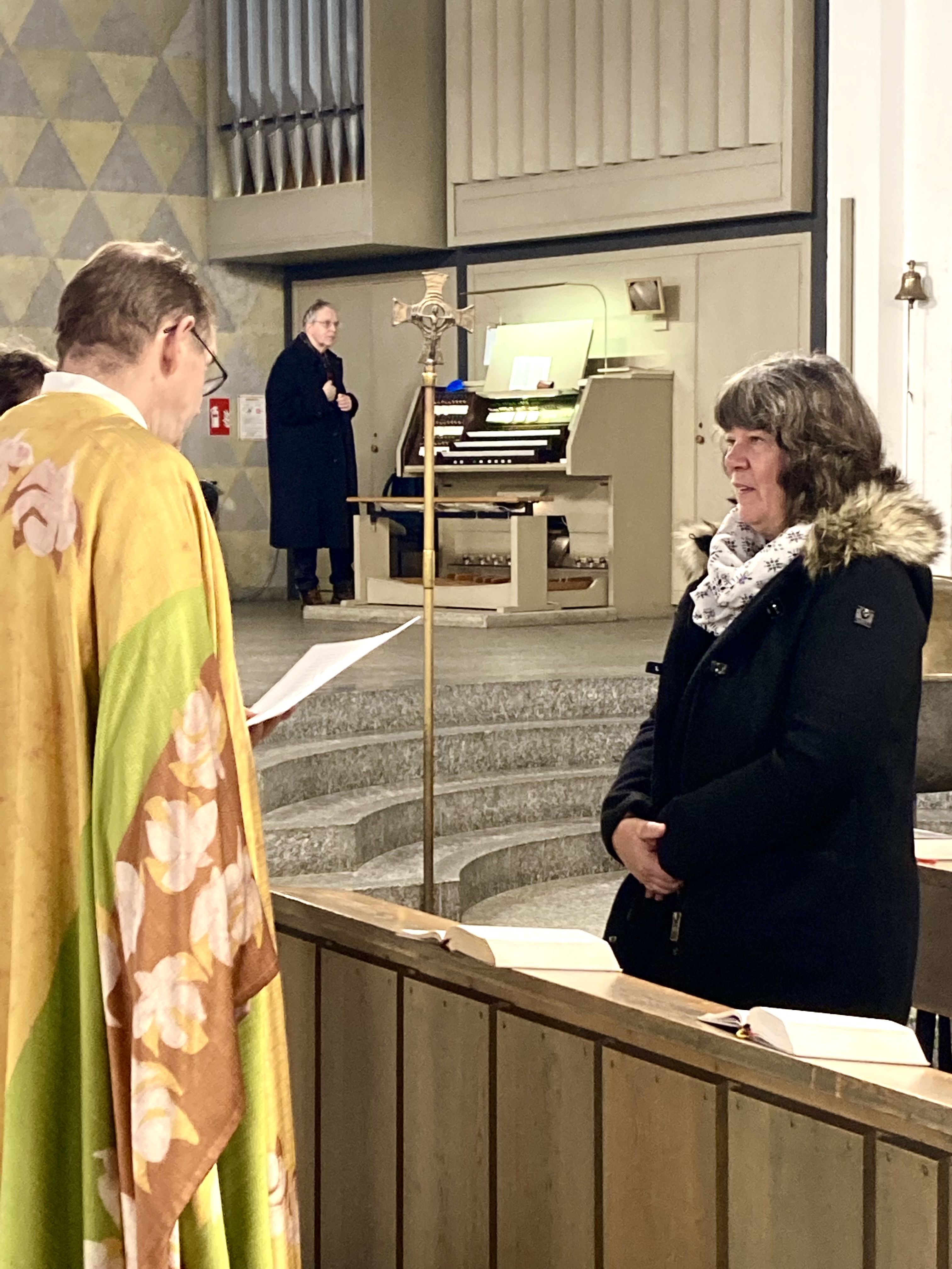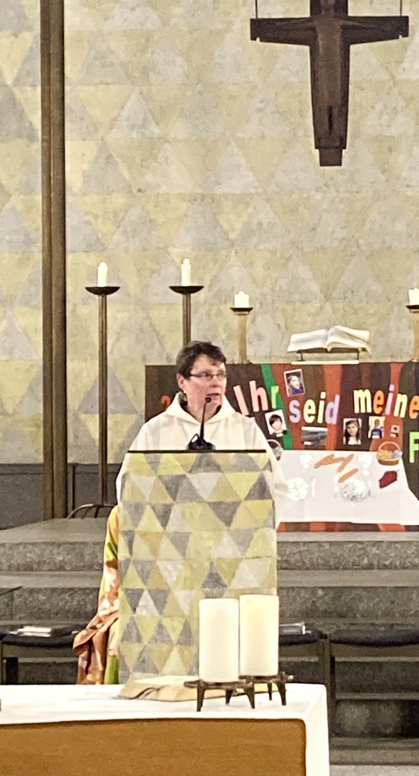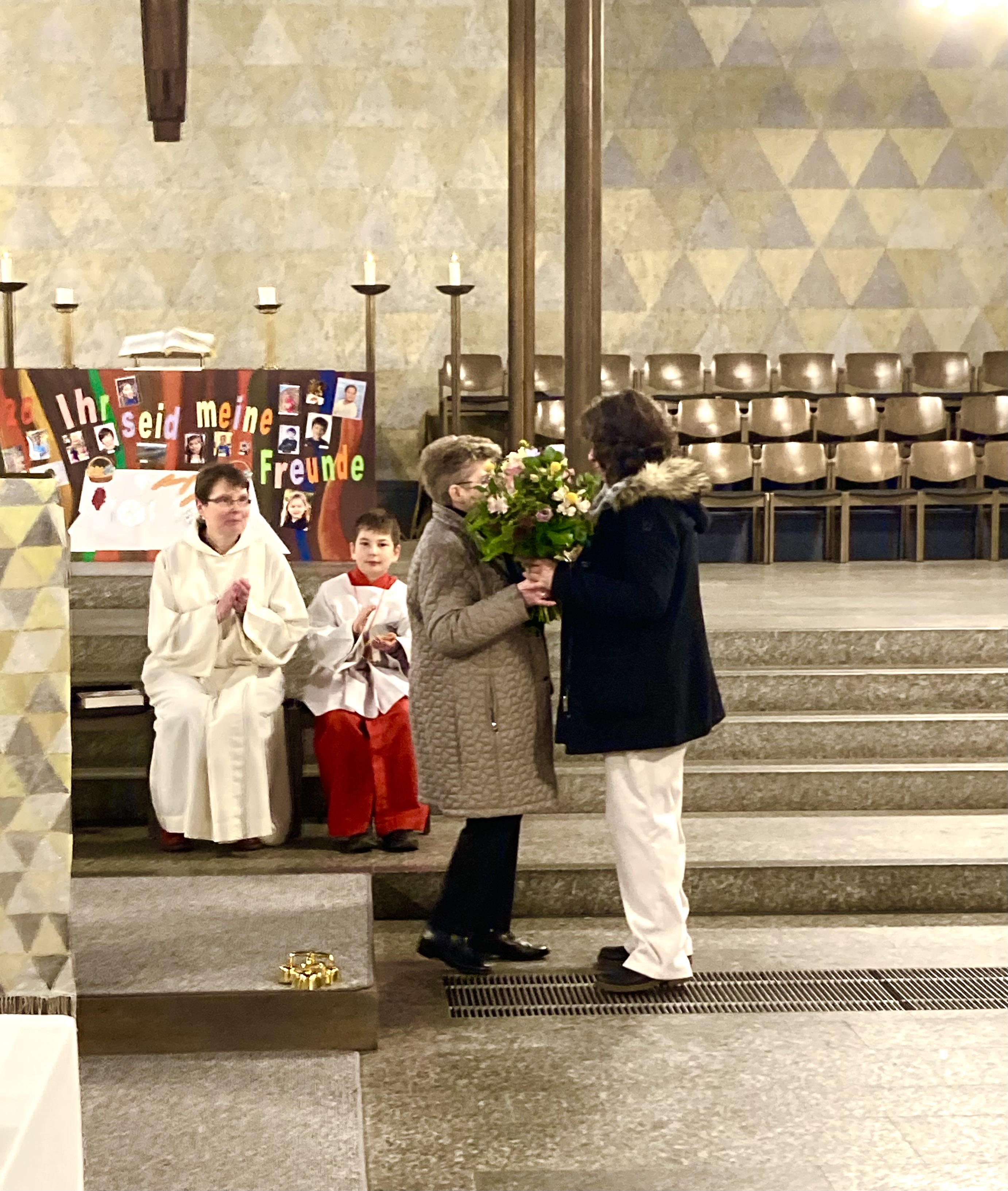 Die Verabschiedung fand im Vormittagsgottesdienst in der Ortskirche María Hilf statt. Pfarrer Thomas Schmidt feierte diesen ungewöhnlich gut besuchten Gottesdienst, und Pastoralreferentin Beate Buballa hielt die Laudatio für unsere Pfarrsekretärin. Ihre Familie nahm ebenso an diesem Abschiedsgottesdienst teil.