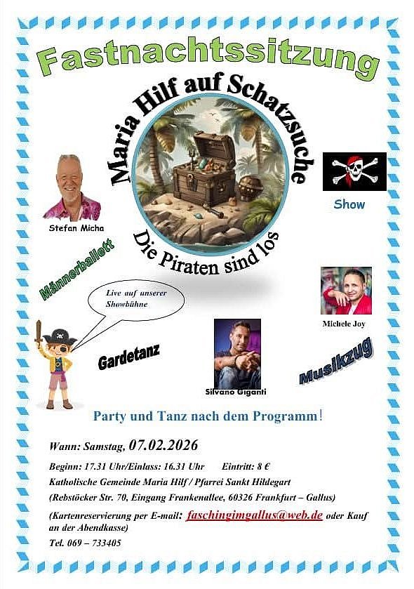 Die Fastnachtssitzung der katholischen Gemeinde Maria Hilf in Frankfurt-Gallus steht 2026 unter dem Motto „Maria Hilf auf Schatzsuche – Die Piraten sind los“ und verspricht einen bunten Abend mit Musik, Tanz und Showeinlagen.klaapariser-musikzug+1