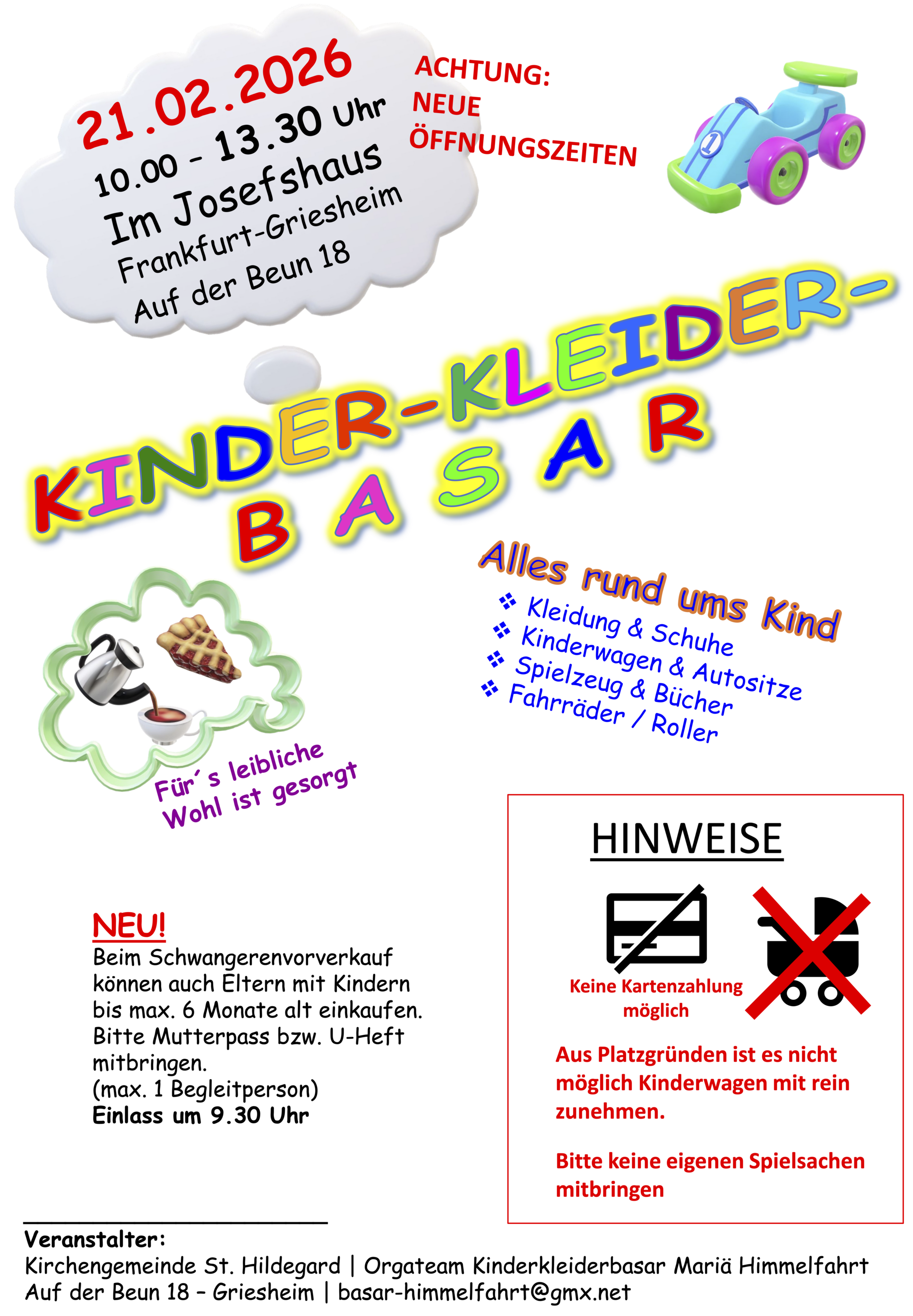 Am Samstag, den 21. Februar 2026, lädt die Kirchengemeinde St. Hildegard gemeinsam mit dem Orgateam des Kinderkleiderbasars Mariä Himmelfahrt wieder zum großen Kinder-Kleider-Basar ins Josefshaus nach Frankfurt-Griesheim ein. Zwischen 10.00 und 13.30 Uhr verwandelt sich das Haus an der Adresse Auf der Beun 18 in einen Treffpunkt für Familien, die gut erhaltene Dinge rund ums Kind verkaufen oder günstig erwerben möchten.
