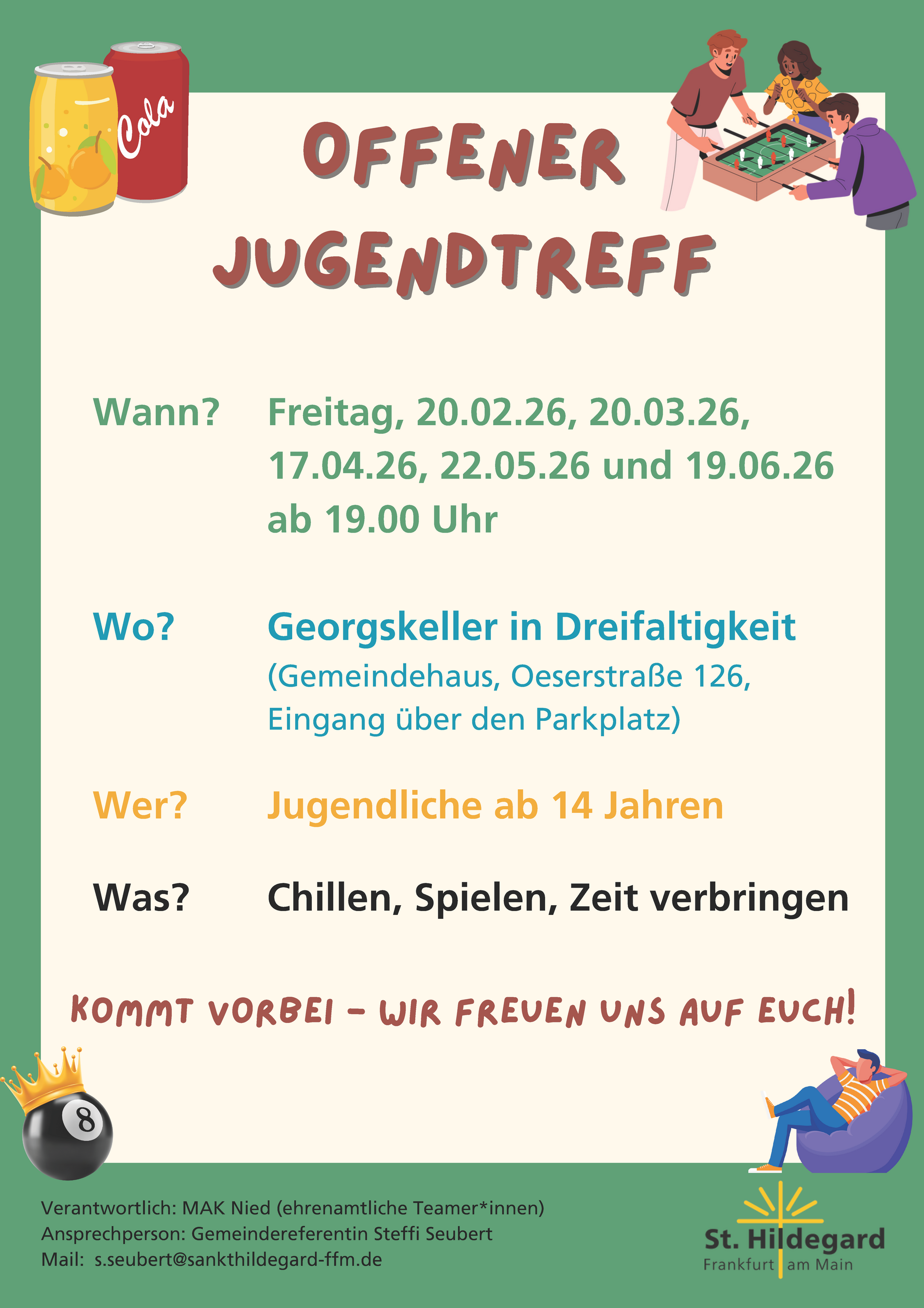 Ansprechperson ist Gemeindereferentin Steffi Seubert, bei Fragen kannst du ihr gerne schreiben: s.seubert@sankthildegard-ffm.de.